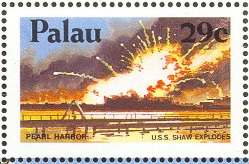 The spectacular explosion of her forward magazine provided one of the most iconic photographs of the attack (depicted on the stamp). She was repaired within a few months of the attack, and served in the Pacific through the rest of World War II, earning eleven battle stars.