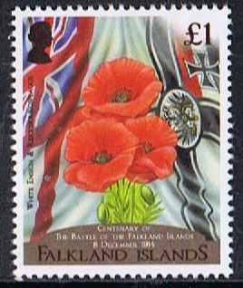 The First Day Cover illustration is based on a photograph of the unveiling of the Battle of the Falkland Islands war memorial in Stanley.