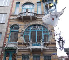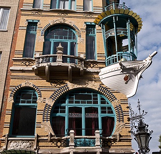 The house has characteristic symmetrical shapes, arches and decorative surfaces with curved, plant-like designs and layers of yellow brick, which are typical for Antwerp Art nouveau architecture. The first floor balcony is exactly modeled on the wooden bow of a sailing ship. The house is decorated with stained-glass windows carrying the names of the five different continents.