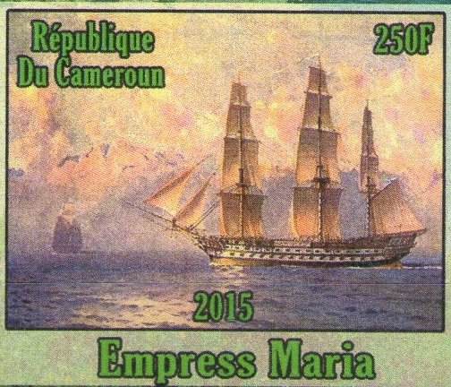 Empress Maria(battleship, 1853). The design of the Cameroun stamp is made after painting of A.B.Нansen.