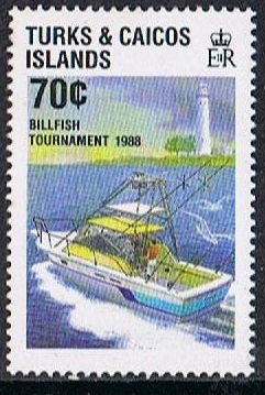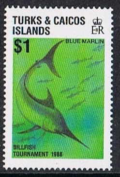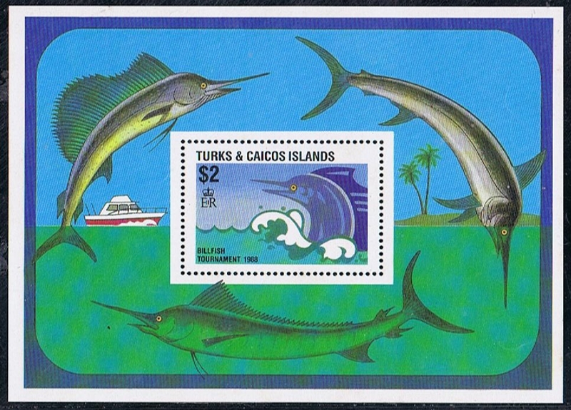 To hail the 1988 Billfish Tournament, the Turks & Caicos issued four new stamps and a souvenir sheet.