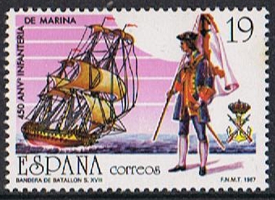 Spain issued one stamp in 1987 to honour the 450th anniversary of the founding of the Spanish Marine Corps, the first founded Marine Corps in the world. The mariner depict carries the flag of the battalion of the XVIII century, the current shield of the corps is depict on the right of the stamp.
