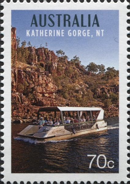 The Australian Post gives by the stamp: Canoe and flat-bottomed boats carry tourists along the dramatic Katherine Gorge carved through ancient sandstone by the Katherine River and the central attraction of Nitmiluk National Park. https://en.wikipedia.org/wiki/Nitmiluk_National_Park
