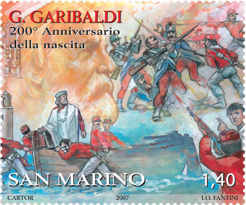 In 2007 Italy and San Marino both celebrate the 200th anniversary of Giuseppe Garibaldi’s birth, Italy issued one stamp and San Marino three stamps.