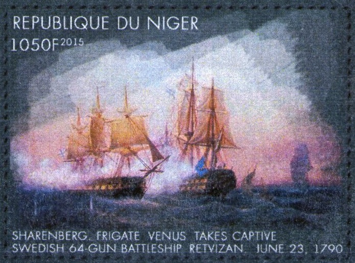 Battle of Vyborg Bay - a battle in the Russian-Swedish War (1788-1790), which took place on June 22 (July 3) in 1790 in Vyborg Bay of the Baltic Sea. Swedish fleet under the command of the Swedish king Gustav III and Grand Admiral Prince Charles, was blocked in the northern Gulf by two squadrons Baltic fleet of Russia under the command of Admiral Vasily Chichagova. Swedish fleet barely broke through the encirclement and retreated to the Sveaborg, suffering heavy losses - 7 ships of the line, 3 frigates, 4-5 ths. (by some estimates - 6-7 ths.) People personnel. Swedish sailing fleet, surviving at breaking the blockade, went to sea and headed for repairs to the sea fortress Sveaborg. "Retvizan" (the Swedish Rättvisan- Justice) - 64-gun sailing ship of the line. After launching in 1783, he was a member of the Swedish Navy, took part in the Russian-Swedish War of 1788-90 years. June 23 (July 4), 1790, a day after a failed Swedes Vyborg battle, "Retvizan" badly damaged and lagging behind the outgoing Swedish squadron, was overtaken by Sveaborg Russian 44-gun frigate "Venus" (former Swedish frigate. See viewtopic.php?f=8&t=15081) Under Captain 2nd Rank RV Crown and 66-gun linear ship "Izyaslav" and the hour and a half after the battle surrendered to the team of "Venus". "Retvizan" was included in the Russian fleet. In his composition, he attended a Dutch expedition in 1799, the second Archipelago expedition of 1805-07's. After passing in 1808 in Lisbon, the British squadron was in 1813 officially sold to the British government. Later, the name "Retvizan" was awarded a number of warships in the Russian Navy. .The design stamp is made after painting of K. V. Sharenberg.