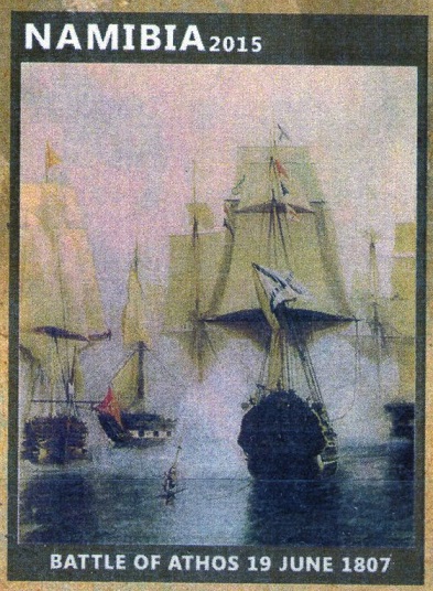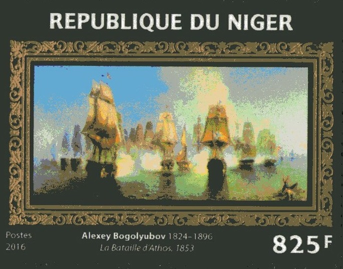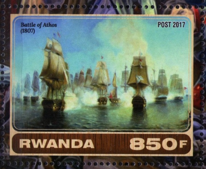 The design stamp is made after painting of Aleksey Bogolyubov: “Battle of Athos 1807”.