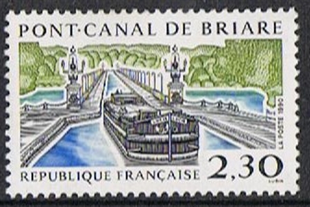 The stamp shows us an inland barge leaving the Briare aqueduct across the Loire https://en.wikipedia.org/wiki/Briare_aqueduct, the canal barge is a spits of which many could be found on the Dutch, German, Belgium and French canals, it are narrow canal and river vessels. https://en.wikipedia.org/wiki/P%C3%A9niche_(barge)