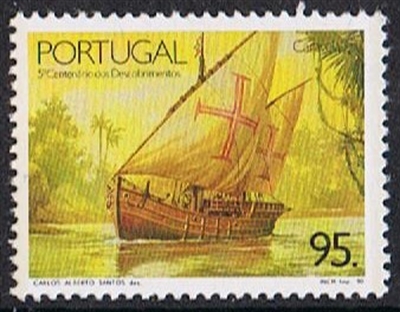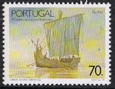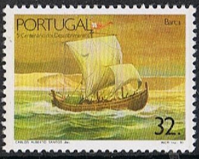 CARAVELAS PESCAREZAS; The stamps shows us a “caravelas pescarezas” which was first mentioned in the 1430s and survived into the 16th century. Used for fishing and trading in the Portuguese coastal waters, sometimes open but mostly fully decked when used by explorers and for trading.