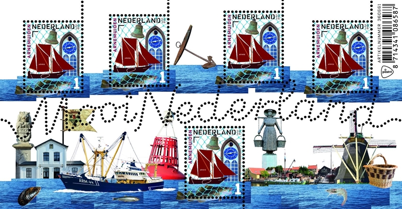 Arnemuiden The five identical stamps with a value denomination of 1 for mail within the Netherlands feature typical objects and buildings found in the town of Arnemuiden: the Hoogaars ARM 16 (pictured), a church bell (pictured) and the Dutch Reformed Church’s astronomical clock (pictured), with the sea below. Pictured at the bottom is an image of a cod. The image is spread across the stamp and the back of the sheet. The top and bottom parts of the stamp are linked together by a traditional fishing net in a contemporary bright colour. The background of the stamp sheet contains images of various Arnemuiden landmarks, including an anchor, a stone lion with a shield featuring Arnemuiden’s coat of arms, the front wall of the station, a historic flag of the city, the Kotter ARM 44 NEELTJE JANNETJE, a light buoy, the historic shipyard with its surrounding houses, the statue of the female fish pedlar, the Nooitgedacht windmill and a typical Arnemuiden prawn basket. The strip of sea pictured on the stamps has been extended horizontally across the sheet like a tile panel. In the body of water shown at the bottom, we see the cod in the bottom stamp as well as other species of fish. Pictured from left to right: a mussel, a herring and a North Sea prawn. The font used is Oxide by FontFont, designed by Christian Schwartz (2010).