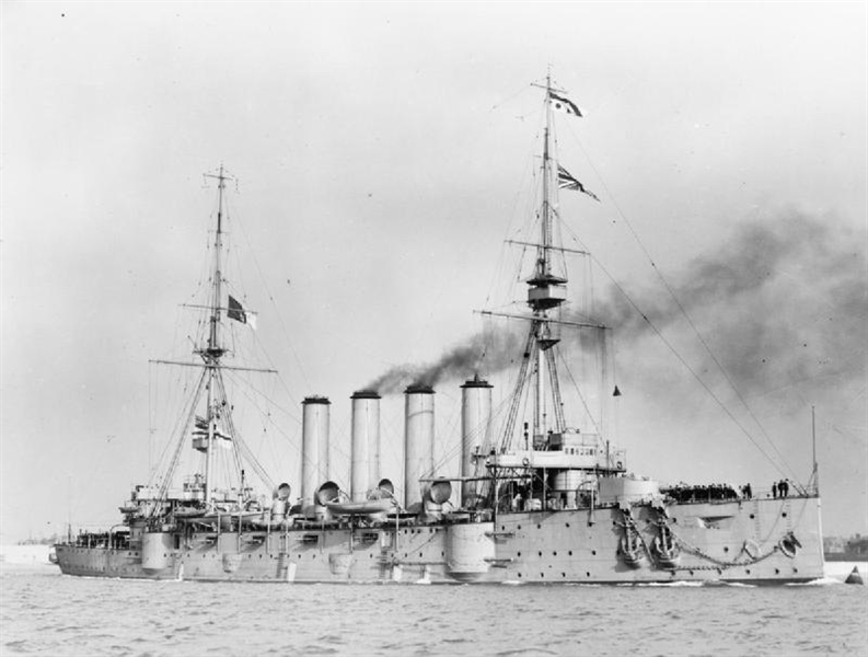 Armament: 2 – single BL 9.2 inch Mk X guns, 12 – single BL 6 inch Mk Vii guns, 12 single QF 12 pdr. 12 cwt guns, 3 – QF 3 pdr. Hotchkiss guns and 2 single submerged 18 inch torpedo tubes.