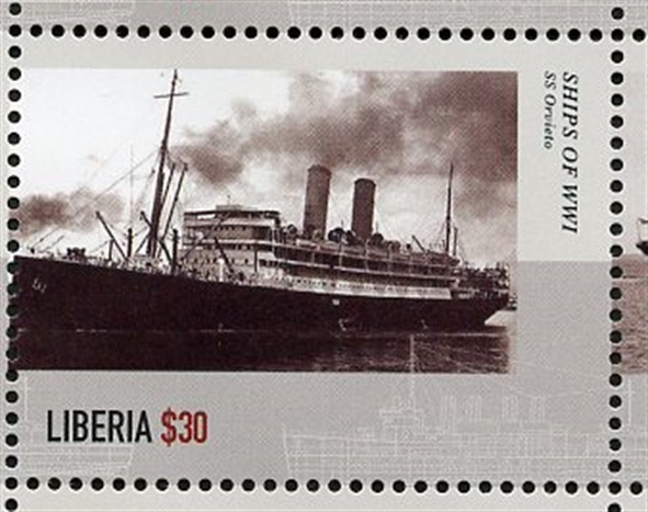 While calling at Colombo on November 15th, the ORVIETO took on board a number of prisoners from the German cruiser EMDEN which had been disabled and grounded by HMAS SYDNEY after 70 days marauding in the Indian Ocean. The prisoners included the ship's captain (von Müller) and torpedo officer (Prince Franz Josef von Hohenzollern). The Australian troops and German POWs were disembarked on arrival at Suez and the ORVIETO proceeded to London, arriving in January 1915.