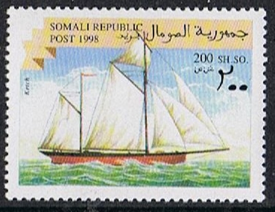 The 200 SH SO stamp of the Somali Republic depict a modern top-sail ketch rigged cargo vessel.