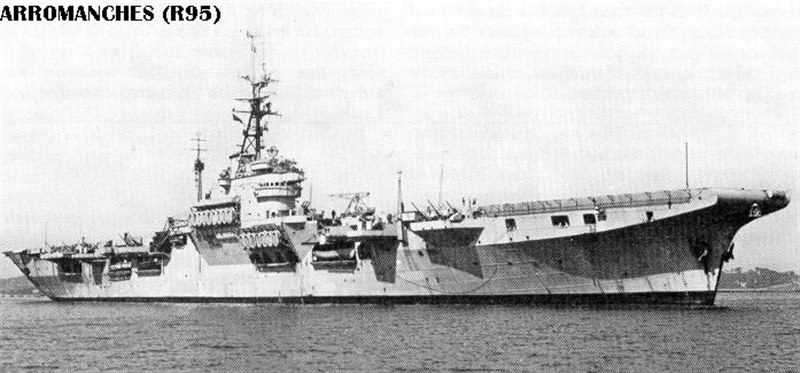 Mr. Peter Crichton gives that the USS ORISKANY had a gun deck under the bow when built (later removed but still she had a different bow.) then he gives, I believe she is one of the Colossus class of the Royal Navy and could well be the French FS ARROMANCHES.