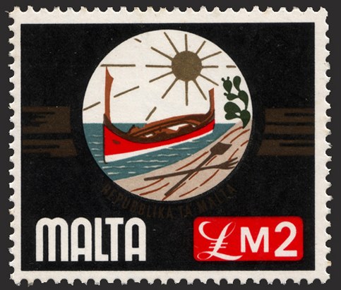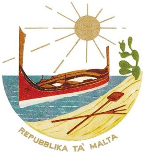 This coat of arms was adopted on the 11 July 1975, seven months after Malta became a republic. It showed a coastal scene with the rising sun, a traditional Maltese boat, a shovel and a pitchfork, and an Opuntia. All of these symbols are somewhat connected to Malta. Underneath the image the then new name of the state "Repubblika Ta' Malta" (Republic of Malta) was written.