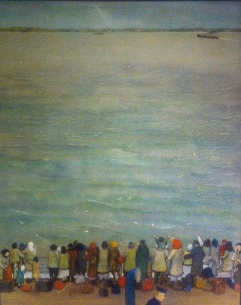 Kurelek created a six-panel master piece entitled “The Ukrainian Pioneers” in which he depicted the many hardships which faced all immigrants before and after their arrival in Canada and during the pioneer era. Four of the panels were used by Canada Post to mark the centennial of the beginning of Ukrainian mass immigration to Canada. The four 40c stamps were issued on 29 August 1991. One of the stamps (partly) shows a family aboard a ship looking at their new land. The identity of the ship is not known. Part of the deck and railing of a passenger ship is visible.