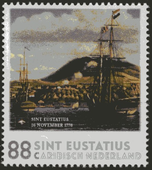 The name of the island, “Sint Eustatius”, is the Dutch name for Saint Eustace, a legendary Christian martyr.The island was seen by Christopher Columbus in 1493 and claimed by many different nations. From the first settlement, in the 17th century until the early 19th century, St. Eustatius changed hands twenty-two times. In 1636, the chamber of Zeeland of the Dutch West India Company took possession of the island that was then reported to be uninhabited. As of 1678, the islands of St. Eustatius, Sint Maarten and Saba fell under direct command of the Dutch West India Company, with a commander stationed on St. Eustatius to govern all three. At the time, the island was of some importance for cultivation of tobacco and sugar. The island sold arms and ammunition to anyone willing to pay. It was one of the few places from which the young United States could obtain military stores. The good relationship between St. Eustatius and the United States resulted in the noted "First Salute". On November 16, 1776, Captain Isaiah Robinson[9] of the 14-gun American brig Andrew Doria,[10] sailed into the anchorage below St. Eustatius' Fort Oranje. Robinson announced his arrival by firing a thirteen gun salute, one gun for each of the thirteen American colonies in rebellion against Britain. Governor Johannes de Graaff replied with an eleven gun salute from the cannons of Fort Oranje. International protocol required a two gun less acknowledgement of a sovereign flag. The Andrew Doria flew the Continental Colors of the fledgling United States. It was the first international acknowledgment of American independence.[Note 1] The Andrew Doria had arrived to purchase munitions for the American Revolutionary forces. She was also carrying a copy of the Declaration of Independence which was presented to Governor De Graaff. An earlier copy had been captured on the way to Holland by the British. U.S. President Franklin Delano Roosevelt came to St. Eustatius in 1939 to recognize the importance of the 1776 "First Salute". He presented a large brass plaque to St. Eustatius which is displayed today under a flagpole atop the walls of Fort Oranje. The plaque reads:"In commemoration to the salute to the flag of the United States, Fired in this fort November 16. 1776, By order of Johannes de Graaff, Governor of Saint Eustatius, In reply to a National Gun-Salute, Fired by the United States Brig of War Andrew Doria, Under Captain Isaiah Robinson of the Continental Navy, Here the sovereignty of the United States of America was first formally acknowledged to a national vessel by a foreign official. Presented by Franklin Delano Roosevelt, President of the United States of America"