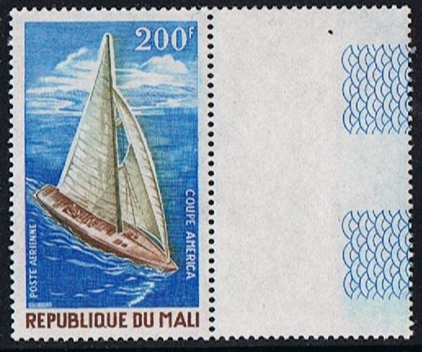 The stamp issued by Mali in March 1971 shows us an unnamed America cup yacht, most probably for the 1970 America Cup races in Newport, Rhode Island which was won by the America yacht INTREPID, at that time the yachts used in the race were of the 12m class. https://en.wikipedia.org/wiki/12-metre_class