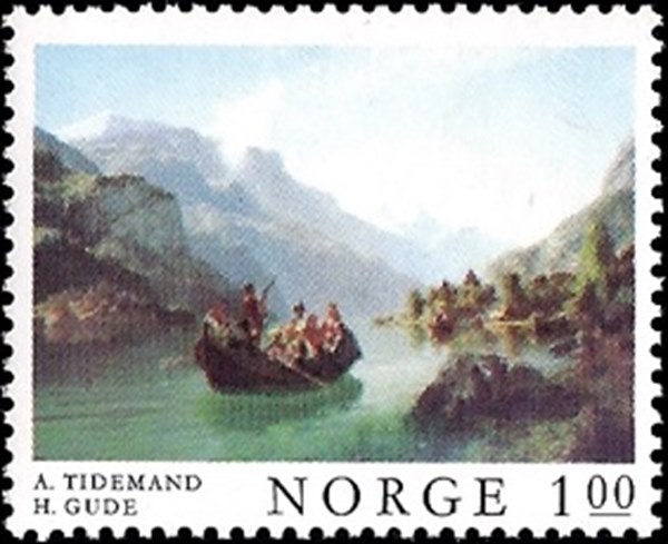 On this stamp issued by Norway in 1974 you see a bridal boat carrying the bride and groom and her guests dressed in traditional garb on her wedding day to or from the church some-where in the Hardanger fjord, Norway.