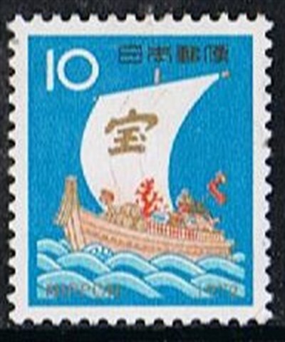 The mythological treasure ship (Takarabune 宝船) is laden with treasure (Takara 宝). Says JAANUS: “The Chinese character BAKU 獏, a Chinese imaginary animal thought to devour (i.e. prevent) nightmares, is sometimes found written on the sail. Often auspicious cranes and tortoises are depicted in the sky and the sea. Although the origin of treasure-boat paintings is not clear, one Edo-period record indicates that they were started in the Muromachi period.
