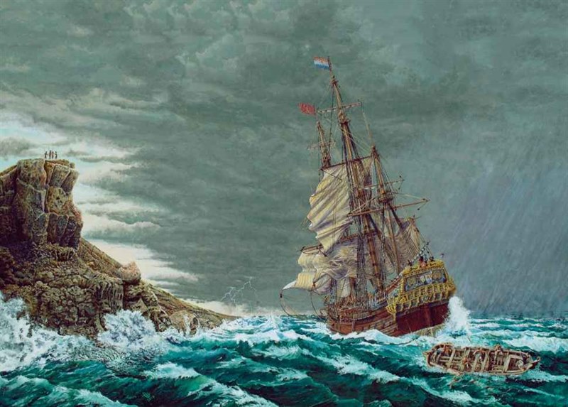 In Adriaan De Jong’s evocative painting, he shows how the ZUYTDORP has already turned sideways in front of the rocks with her stern pointing to the north, which Adriaan describes as “speculative but plausible”.