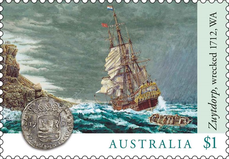 When Dutch-born artist Adriaan De Jong conceived of painting the wrecking of the ZUYTDORP, which appears on the stamp, he had much to consider, especially as no survivors of the wreck came forward to report the event or give their version of it. He also had to think about the weather and other circumstances that may have led to the wrecking event, let alone what the ship itself may have looked like, including the detailed sterns typical to VOC ships of the era.