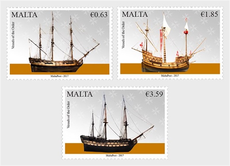 The fifth issue from the Maritime Malta series consists of three stamps which feature vessels dating back to the Order of St John. Towards the beginning of the 18th century, the Order adopted a squadron of square-rigged warships known as 'third rate ships-of- the-line' and armed with 56 iron cannon spread on two decks. The heavier ones were placed on the quarterdeck while the lighter ones were mounted on the forecastle and on the poop deck. These vessels defended the Order from the Barbary corsairs in the Mediterranean and also supported the Order when venturing into the Atlantic Ocean.