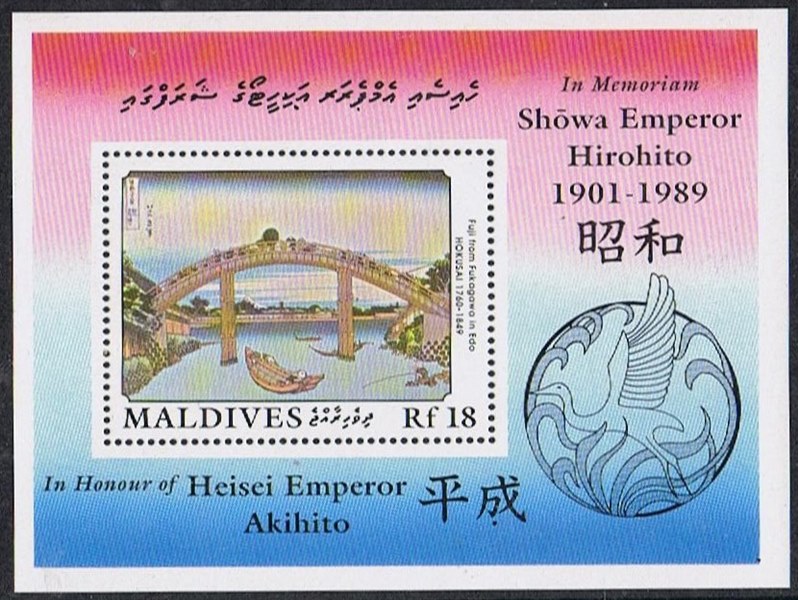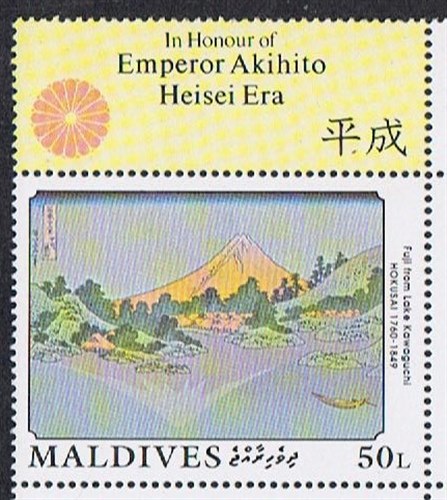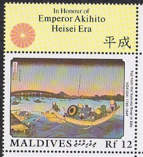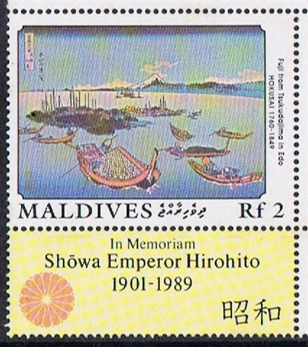 The Maldives used a set of stamps and a miniature sheet in 1989 with paintings from the Japanese artist Hokusai: https://en.wikipedia.org/wiki/Hokusai