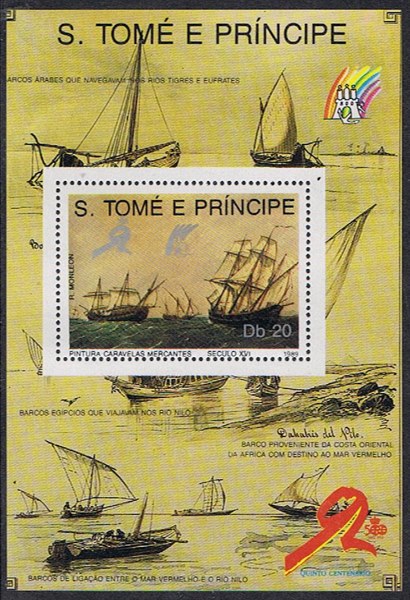 St Thomas and Prince Islands issued in 1989 a set of five stamps and six miniature sheets al with paintings made by the Spanish painter Rafael Monleón y Torres https://en.wikipedia.org/wiki/Rafael_Monle%C3%B3n and in the margins of five miniature sheets drawings of ships and boat types around the world.