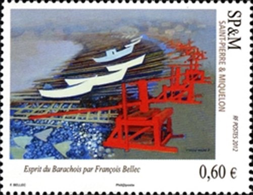 In 2013 St Pierre et Miquelon issued two stamps of 0.60 Euro with paintings on it. The stamp painted by the French maritime painter François Bellec gives Esprit de barachois and shows us “doris” pulled on shore by a capstan at Langlade. More info on the doris is given on: http://www.shipstamps.co.uk/forum/viewt ... ris#p12785
