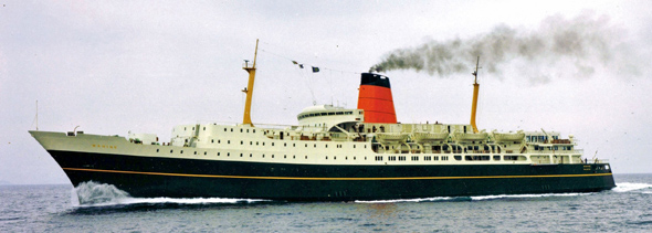 Ferry passenger/vehicles, Gt:8944, Nt:3951, Dw:1430, Loa:149m. (488') B:22m. (71') Depth:12.65m. (41'6") Draft:5.18m. (17') 4 boilers, 2 AEI turbo-alternators driving 2 AEI propulsion alternators:? hp. twin screw, 22 kn. 6 decks, complement:126, passengers daytime:1050, at night:927 in more than 300 1, 2, 3 and 4 persons cabins, 200 cars, IMO.6519584.