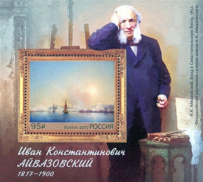 The postage stamp features the Entrance to Sevastopol Bay (1852) painting by Ivan Aivazovsky, and the souvenir sheets margins bear a portrait of the artist.