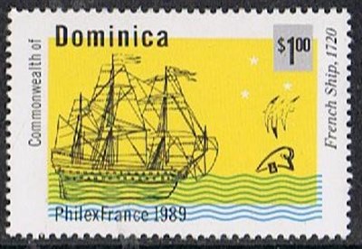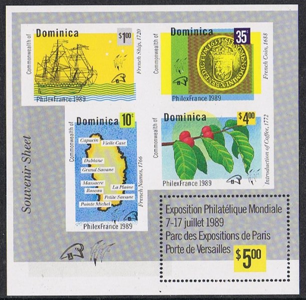 Dominica issued in 1989 four stamps and a miniature sheet for the Exposition Philatélique Mondale in Paris from 7 to 17 July,