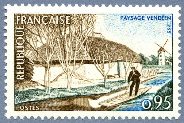 This stamp “ Paysage Vendéen” represents a maraichin (the inhabitants or farmers of the marshes) in the bow of a bourrine (yole vendéene).