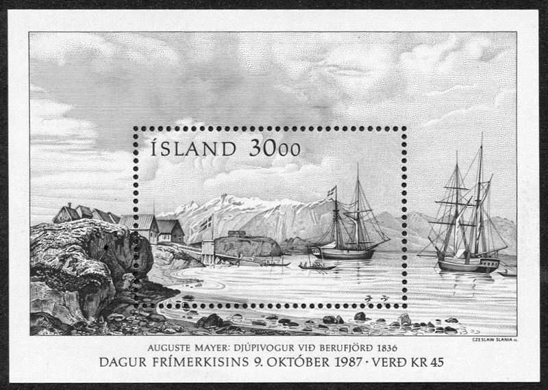 The stamp is designed after an illustration made by Auguste Mayer in the book, Voyage en Islande et au Groënland exécuté pendant les années 1835 et 1836 sur la corvette La RECHERCHE written by the Frenchman Paul Gaimard. More on the Le RECHERCHE is given on:viewtopic.php?f=2&t=13089&p=19273&hilit ... che#p19273