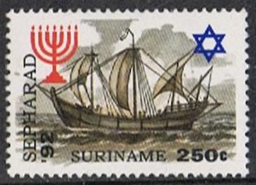 Suriname issued in 1992 one stamp for the expelling of the Jews from Spain in 1492, the stamp shows a Spanish, Portuguese sailing ship from that time and named by Stanley Gibbons as a “nau”. The rigging looks a bit strange on the nau depict on the stamp, it shows a four mast ship, square sails on the fore and main mast and two lateen sails on the other two masts. Most naus carry on the fore and main mast also a topsail not visible on the stamp.