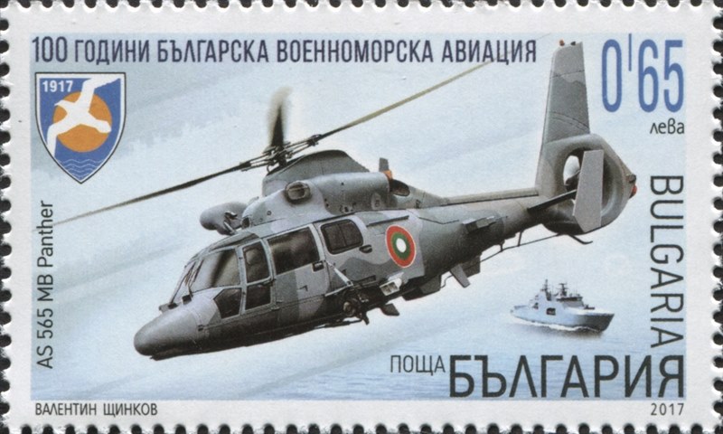 Bulgaria issued in 2017 one stamp for the 100th years Bulgarian Naval Aviation, which shows us a helicopter with on the right a naval vessel.