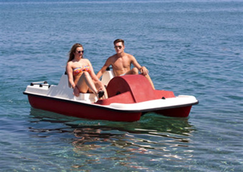 The paddle wheel of a pedalo is a smaller version of that used by a paddle steamer. A two-seat pedalo has two sets of pedals, side by side, designed to be used together. Some models, however, have three pedals on each side to allow a person boating alone to pedal from a centrally seated position.