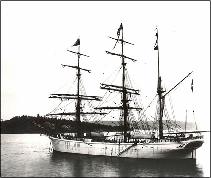 Tonnage 451 brt, 401 net, dim. 143.6 x 30.3 x 15.1ft.Bark rigged.