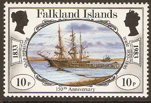 Sometimes this involves writing many letters to people we don’t even know, or reading through volumes of books and magazines. Sometimes one almost gives up just before the answer turns up from an unexpected source. Take for example the 10p value of the Falkland’s 150th Anniversary set that was issued on January 3rd 1983, depicting a pair of ships under the title “Ship repairing trade 1850-1890”.