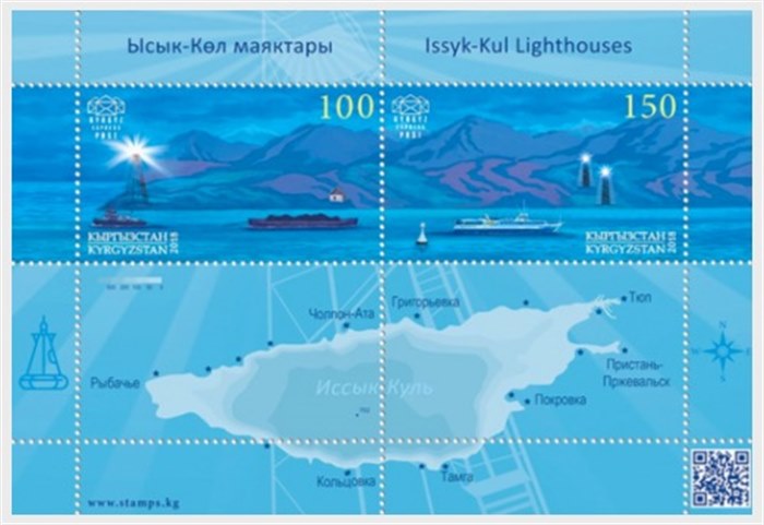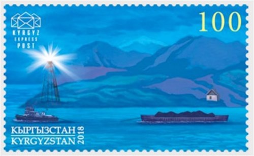 Kyrgyzstan issued in 2018 two stamps and a miniature sheet which shows us lighthouses around Lake Issyk-Kul with shipping on the lake.