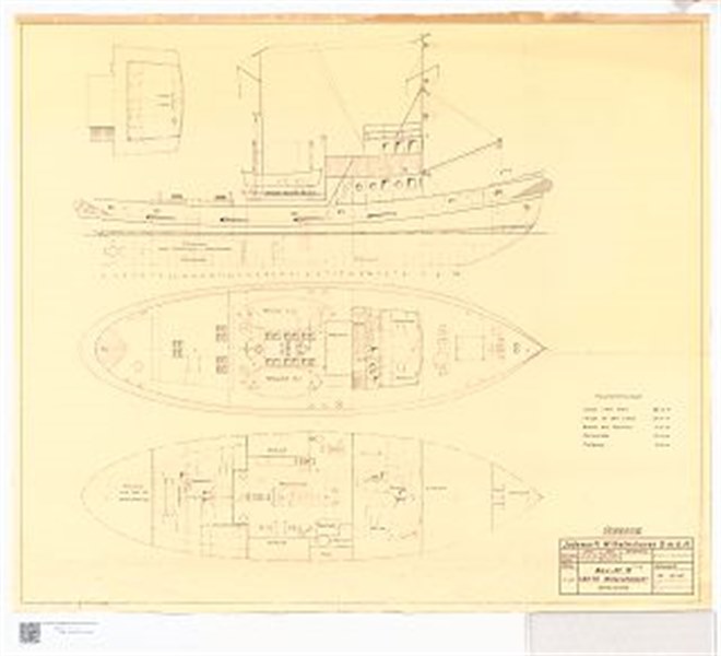 Tonnage 96 grt, 29 nrt, dim. 36.50 x 7.30 x 2.50m. draught 2.40m, length bpp. 26.50m.