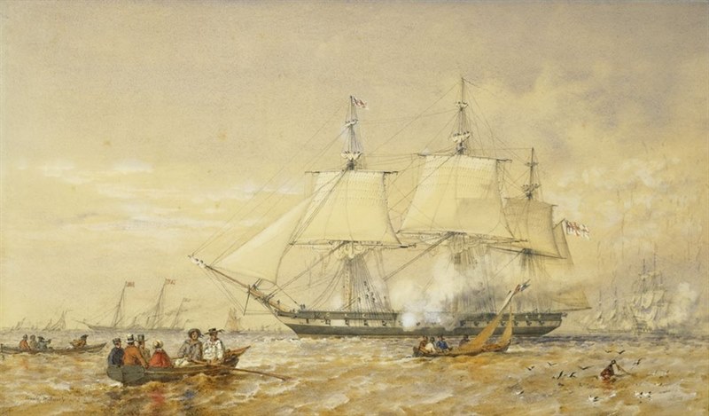 Prince Alfred, the second son of Queen Victoria and Prince Albert, was appointed to HMS EURYALUS after passing his naval entrance exams. The EURYALUS was a 50-gun screw frigate which had been launched in 1853, and the Prince served on it for two years between 1858 and 1860 as a naval cadet and midshipman. On 1 January 1860 Prince Alfred sailed in the EURYALUS from Malta for Syracuse, Palermo, Elba and Gibraltar, returning to Spithead in February, That summer he joined the ship on a voyage to Rio, the Cape of Good Hope, Natal and the West Indies. Brierly worked for three members of the Royal family through his long career as a marine painter, and after his death, his daughter recorded that the interest Queen Victoria had always taken in his work had been ‘one of the happiest memories that remained with him and cheered him to the very last’.