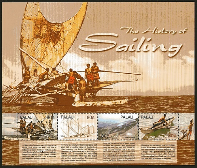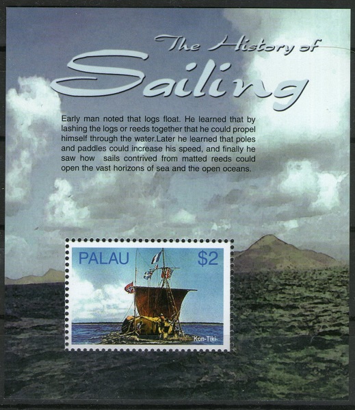 Palau Post has issued miniature and large sheets dedicated to the old ships and boats of Oceania. On a small sheet, we see a replica of the BALS INCLET RAT built by Thor Heyerdahl, on which he crossed the Pacific Ocean. Text: “Early man noted that logs float. He learned that by lashing the logs or reeds together that he could propel himself through the water. Later he learned that poles and paddles could increase his speed, and finally he saw how sails contrived from matted reeds could open the vast horizons of sea and the open oceans”. See more: viewtopic.php?f=2&t=6776.
