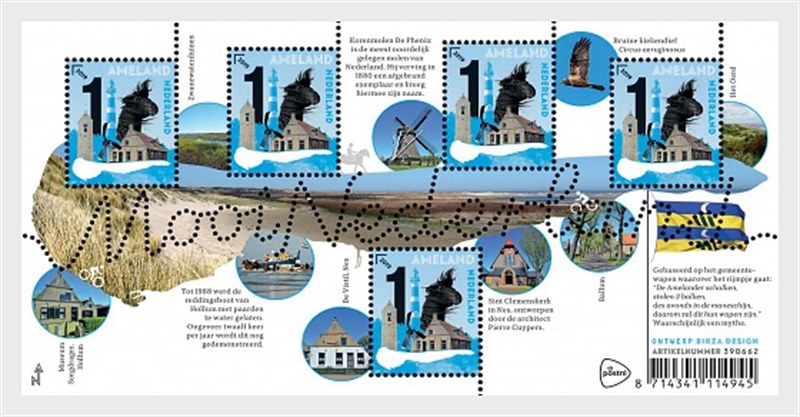 Ameland was made on the basis of the well-known design and perforation of the series Beautiful Netherlands. On the stamp with a light blue background there is a huge black 1 on the left. This value is connected with a blank island map of Ameland with a blue contour line. All around there are photos with typical Ameland images: the lighthouse Bornrif at Hollum, the bell tower of Nes, a Frisian horse with blown-about manes, the propeller monument between Hollum and Ballum and a characteristic Ameland commander's house from 1675 in Hollum. The country name Nederland (the Netherlands) is shown in blue on the right of the stamp and the island name Ameland is in white on top. The year of issue 2019 has been placed at an angle in the sorting symbol on the left.