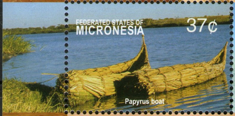 The Micronesian stamp depicts the HOBOLO- boat on Lake Abaya in Ethiopia. Different nations live on the shores of the lake, building similar boats under various names. Different nations live on the shores of the lake, building similar boats under various names. Bayso people Giddiccho island have traditional boat- WOLLABO, a smaller kind is called FAAK’O .All are made of local wood only. The logs are made from the very light and spongy Ambatsh tree. Wooden nails are cut and made from a very hard wood (acacia) and used to link the logs together. Each different logs a wollabo has its own name.The boats are between 5 and 7meters long, and about 1,5meters wide. Due to their shape, the boats should more correctly be called floats, and they are not closed on all sides, but open at the back and there is also space between the different logs. Yet, as the wood is so light, the boats cannot sink and are very safe. The traditional boats are mainly used to regularly transport people from the island to the shores to visit merkets in Mirab Abaya (western shore of lake).Smaller paddles are used for floats. Researcher Haberland saw boats from 13 to 16 feet in length, made of extremely light planks of white wood, which can carry up to 12 people, which were mainly used by Haruro’s people (From the island of the same name) to transport hippo meat. The boats were called HOBOLO (obolo). As a mover, used the paddle and pole. The form and method of paddling resemble the Venetian gondola. Sometimes boats were built from papyrus, cane, reed, depending on the size and purpose.