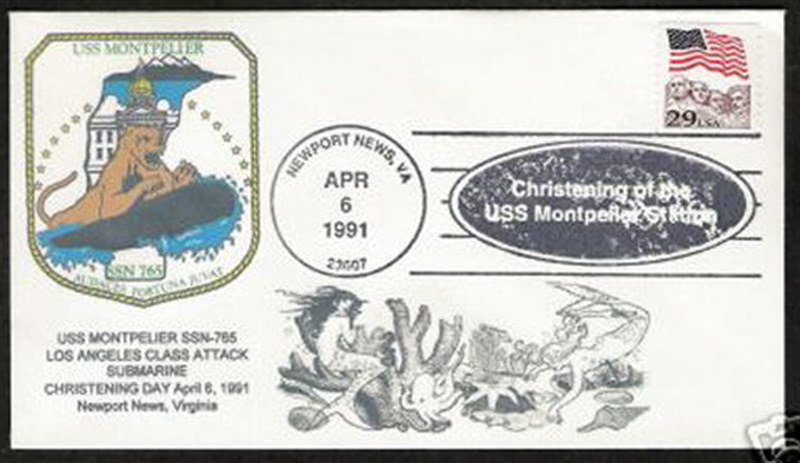 USS MONTPELIER (SSN-765), a Los Angeles-class submarine, is the third ship of the United States Navy to be named for Montpelier, Vermont. The contract to build her was awarded to Newport News Shipbuilding and Dry Dock Company in Newport News, Virginia on 6 February 1987 and her keel was laid down on 19 May 1989. She was Christened April 6, 1991, launched on 23 August 1991 sponsored by Mrs. Nancy Hayes Sununu, and commissioned on 13 March 1993 with Commander Victor Fiebig in command.[
