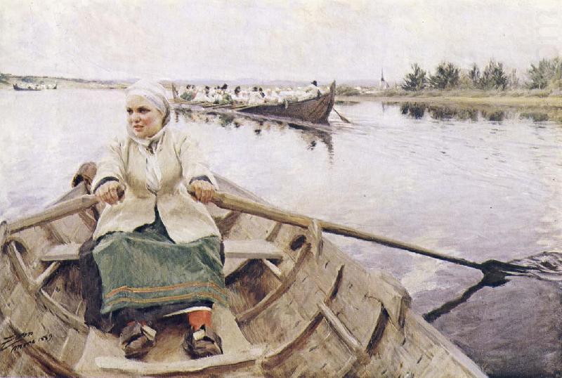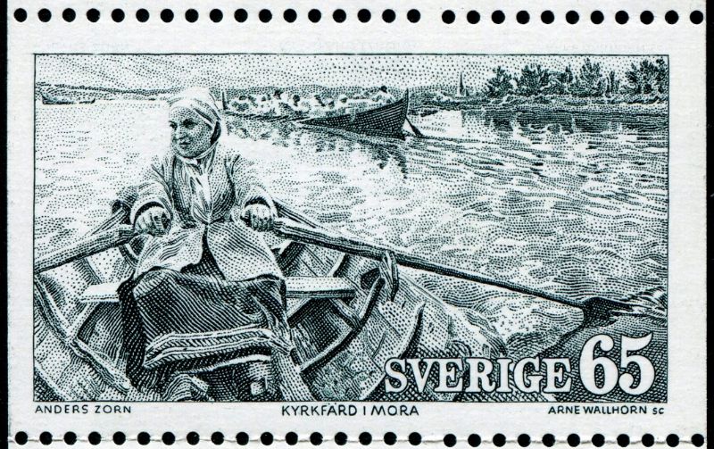 This stamp is designed after a painting made by Anders Zorn (1860-1920) https://en.wikipedia.org/wiki/Anders_Zorn#Paintings “kyrkefard I Mora”.