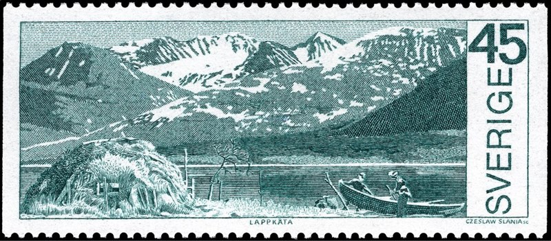 Sweden issued in 1970 five stamps designed on places around the Arctic circle. One stamp shows a lake with a beached boat, which is given as a “lappbåt” of which the Aak to Zumbra a dictionary of the World’s Watercraft gives.