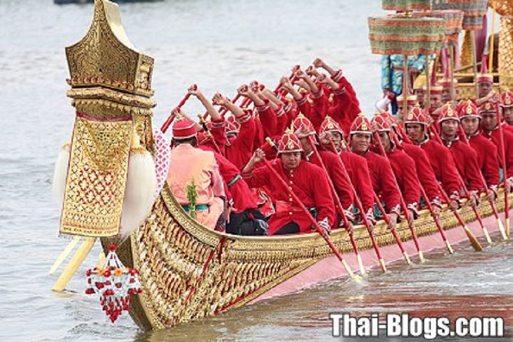 The bow of the Anekchat Puchong Royal Barge features a lacquered, gold-gilded pattern of so many small nagas. It is painted pink on the outside, but its inside bottom is red. This royal barge is 45.67 meters long and requires 61 oarsmen. In the middle of this vessel is the Kanya Throne, whereby the king removes his apparel or headdress for Royal Kathina occasions, before he moves to another boat. The Anekchat Puchong Royal Barge was built in the reign of King Rama V.