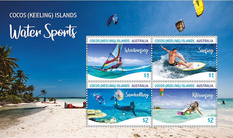 Cocos (Keeling) Islands issued in 2019 four stamps and a miniature sheet for the watersport on the island.